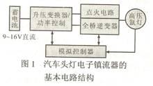 為了滿足燈在啟動(dòng)與穩(wěn)態(tài)時(shí)的不同要求,目前,一般采用的汽車頭燈用電子鎮(zhèn)流器的基本電路結(jié)構(gòu)包含圖1所示的4部分功能。