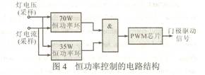 由圖3可知,全橋逆變電路的總體負(fù)載只有燈消耗有功功率,因此燈消耗的功率可近似看作是逆變器的輸入功率。所以通過不斷采樣燈回路上的輸出電壓Uo和輸出電流Io,采用拋物線近似的恒功率控制方法,用模擬電路來實(shí)現(xiàn)可使控制精度達(dá)到±5%左右的恒功率控制。但是,汽車頭燈比較特殊,為了要滿足其在4s內(nèi)達(dá)到額定光輸出的80%這一特殊要求,一開始提供70W的瞬態(tài)功率給燈,而汽車頭燈的額定功率為35W。所以,在設(shè)計(jì)時(shí)需要兩個(gè)恒功率控制環(huán),兩者的切換通過一個(gè)門電路來實(shí)現(xiàn),圖4示出恒功率控制的電路結(jié)構(gòu)