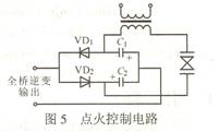 點(diǎn)火方式采用脈沖式點(diǎn)火,電路采用倍壓整流電路。圖5示出點(diǎn)火控制電路。全橋逆變器輸出的正向電壓先把VD2導(dǎo)通,給電容C2充電;輸出的負(fù)電壓把VD1導(dǎo)通,給C1充電。當(dāng)每個(gè)電容都充電到400V時(shí),可使800V的氣體放電管觸發(fā)導(dǎo)通,開始放電。這樣,當(dāng)變壓器初級(jí)產(chǎn)生800V脈沖時(shí),次級(jí)就會(huì)產(chǎn)生上萬伏的高壓脈沖,從而將高強(qiáng)度的氣體放電管雪崩擊穿。