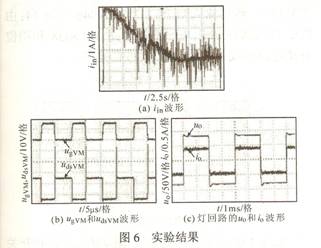 在前述原理分析和實(shí)現(xiàn)方案討論的基礎(chǔ)上進(jìn)行了實(shí)驗(yàn)論證。實(shí)驗(yàn)樣機(jī)是額定功率為35W汽車頭燈電子鎮(zhèn)流器。升壓電路采用反激式電路,選用UC3843作為PWM控制芯片。主要電路參數(shù)有:反激式電路的MOSFET開關(guān)管選用的IRF540;二極管選用MUR860,變壓器的初級(jí)電感Lp=7.8µH,輸出電容選擇耐壓為630V的1µF的CBB電容。圖6b示出反激式變換器穩(wěn)態(tài)下開關(guān)管的驅(qū)動(dòng)電壓UgVM和開關(guān)管漏源極兩端的電壓UdsVM實(shí)驗(yàn)波形。可見,UdsVM有一個(gè)很大的尖峰,是漏感的能量所致。圖6c示出穩(wěn)態(tài)時(shí)兩端的電壓uo及其流過燈的電流io實(shí)際工作波形。由圖可見,燈兩端的輸出功率將近達(dá)35W,這與理論設(shè)計(jì)符合得很好。