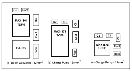 圖3.因?yàn)橐褂秒姼?,升壓轉(zhuǎn)換器(a)比電荷泵(b)占用更大的電路板空間和高度。如果使用晶片級(jí)封裝的MAX1573和0402封裝的1μF電容,整個(gè)電荷泵方案(c)的尺寸就會(huì)非常小。