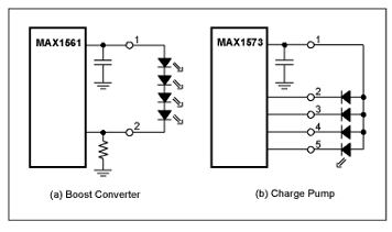 圖1.MAX1561升壓轉(zhuǎn)換器(a)和MAX1573電荷泵(b)是2種LED供電方案。電路復(fù)雜度基本相同,但電荷泵不需要電感。