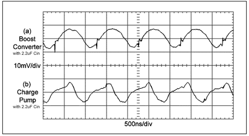 圖5.如果開關(guān)頻率為1MHz,驅(qū)動(dòng)同樣數(shù)量的LED,采用相同的輸入電容,那么電荷泵(b)和升壓轉(zhuǎn)換器(a)的輸入紋波基本相同。然而,由于電荷泵與LED之間有較多引線,建議使用更短的連線(天線),另外,泵電容產(chǎn)生的EMI低于升壓轉(zhuǎn)換器的電感。