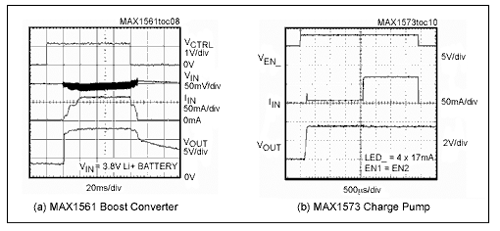 圖6.MAX1561升壓轉(zhuǎn)換器(a)和MAX1573電荷泵(b)的軟啟動(dòng)和關(guān)斷波形都表明沒有輸入過沖電流(IIN),使電池跌落最小,以免對(duì)系統(tǒng)的其它電路造成影響。