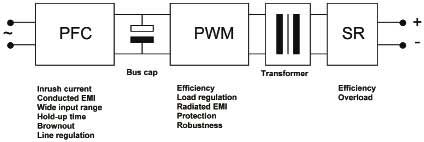 脈寬調(diào)制級(jí)(PWM)是主要的轉(zhuǎn)換器級(jí)。其中DC電壓被斬波為更高頻率的方波,因此利用更小的變壓器就可以轉(zhuǎn)換到另一個(gè)電壓級(jí)并提供隔離。并非所有的拓?fù)涠疾捎谜伎毡茸兓姆讲?,有些拓?fù)洳捎玫氖亲冾l,還有的則是改變兩個(gè)脈沖序列之間的相位。這一級(jí)主要確定轉(zhuǎn)換器的效率和負(fù)載調(diào)節(jié)。轉(zhuǎn)換器效率十分重要,首先它關(guān)系電源的運(yùn)行成本;其次是必須通過機(jī)箱冷卻來散除產(chǎn)生的熱量;第三是熱組件越大,就越昂貴,占用空間也越大。這三個(gè)因素與電源的使用壽命成本關(guān)系重大。
