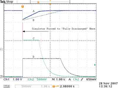 圖3為模擬鋰離子電池充電至4.2V時(shí)獲得的典型V-I波形。從圖中可以看出兩個(gè)測(cè)試過(guò)程:一個(gè)是以1A初始快充電流充電(曲線B和D),另一個(gè)是以2A快充電流充電(曲線A和C)。這兩種情況下,首先進(jìn)入CC階段充電,直到電池電壓達(dá)到終止電壓4.2V。在此之后,電流呈指數(shù)衰減,而仿真電池的電壓保持不變。充電電流為2A時(shí)到達(dá)終止電壓所需的時(shí)間更短,與預(yù)期設(shè)計(jì)相同。然而,請(qǐng)注意,電流加倍不會(huì)使充電時(shí)間減半,只會(huì)使到達(dá)CV模式的時(shí)間減半,與真實(shí)電池負(fù)載的測(cè)試情況一樣。