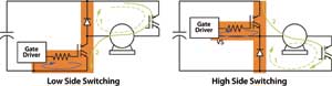 在圖1中,電壓源變頻器的臨界電流路徑被標為紅色陰影,其特征是di/dt變化率高,這個特征也表現(xiàn)在對應的柵極驅動電路上。要保證柵極驅動電路安全的工作,就要最大限度地減小雜散電感。尤其是高壓側柵極驅動電路,存在一個由低壓側二極管和電流通道上的阻性和感性壓降所引起的,且幅度超過VS最小允許電壓的負壓,會導致電路工作異常。