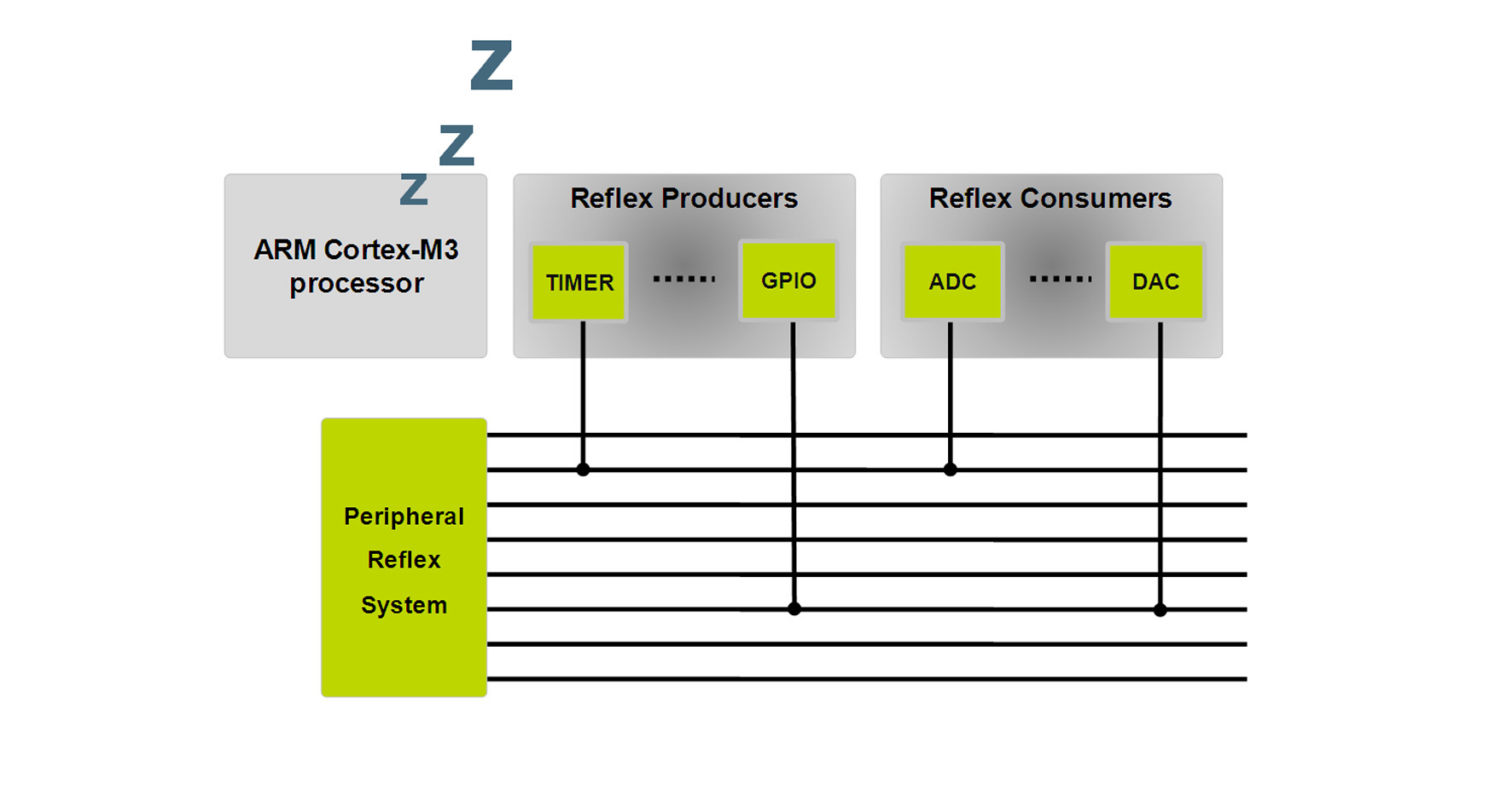 圖4使用一個互連矩陣或外圍設備反射系統(tǒng)可以執(zhí)行簡單的任務如開始數(shù)據(jù)轉換和存儲結果,完全無需喚醒32位處理器內核。