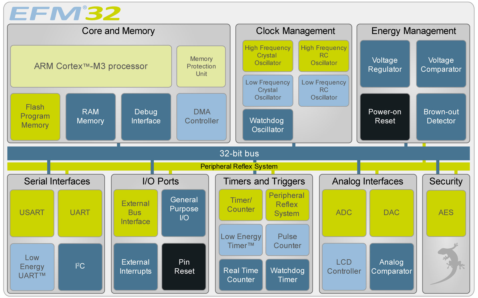 圖4. EFM32 Gecko的獨(dú)特架構(gòu)為低功率操作的設(shè)計(jì)目的提供了廣泛的外圍設(shè)備功能模塊。例如,4 × 40段LCD控制器的運(yùn)行僅需要550nA。