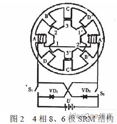 另外,當主開關(guān)器件S2導(dǎo)通時,A相繞組從直流電源U吸收電能,而當S1、S2關(guān)斷,繞組電流經(jīng)續(xù)流二極管VD1、VD2繼續(xù)流通,并回饋給電源U。此,SR電動機傳動的共性特點是具有再生作用,系統(tǒng)效率高。