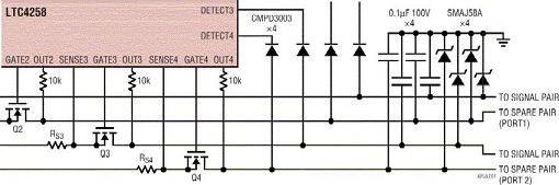 四對PD電路是最大的變化(圖4b)?,F(xiàn)在需要采用兩個LTC4257器件,電源電路必須具備足夠的智能,以便把從每一個通道吸取的電流限制在802.3af規(guī)范容許的范圍之內。要做到這一點,就要平衡從每一對線吸取的電流或平衡從每一對線吸取的功率,直到它接近(但是不超過)ICUT極限,然后,才從其它線對吸取電流。這種電路可能相當復雜,不同的設計之間差異也很大。