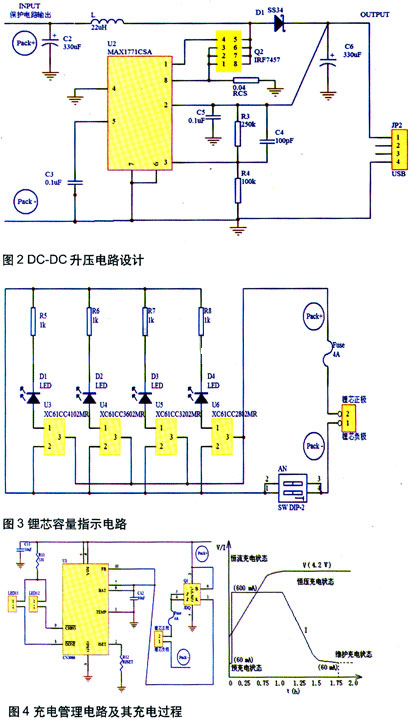 本文論述的電路系統(tǒng)設(shè)計(jì)由五部分組成:鋰芯容量指示電路、電芯保護(hù)電路、充電管理電路、DC-DC升壓電路和功能擴(kuò)展電路。鋰芯容量指示電路由XC61CC系列的電壓監(jiān)控芯片組成。電芯保護(hù)電路由過充保護(hù)、過放保護(hù)、過溫保護(hù)三部分組成,HAT2027、R5402、自恢復(fù)保險(xiǎn)絲構(gòu)建了三重保護(hù),使鋰芯安全性大大增強(qiáng)。充電管理電路采用了CN3066,將充電過程分為涓流充電、恒流充電、恒壓充電和維護(hù)充電四個(gè)部分,使移動(dòng)隨身電源能夠最大程度地儲(chǔ)備能量。DC-DC升壓電路采用了MAX1771集成芯片,可將鋰芯容量在安全范圍內(nèi)最大限度釋放,達(dá)到對(duì)多種數(shù)碼設(shè)備供電的目的。功能擴(kuò)展涵蓋了戶外活動(dòng)所涉及的常見需求,具有應(yīng)急夜間高亮照、戶外防盜安全警報(bào)、野營驅(qū)蚊等功能。