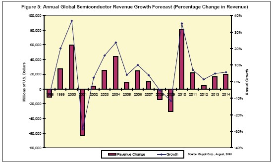 關(guān)于整體經(jīng)濟(jì)和半導(dǎo)體產(chǎn)業(yè),上月最常聽到的一個(gè)詞是“二次探底”。人們擔(dān)心,半導(dǎo)體市場最近的表現(xiàn)好得不太正常,不久肯定會(huì)出現(xiàn)修正。但是,iSuppli公司不同意二次探底的看法。相反,iSuppli公司預(yù)測,2010年下半年和2011年將回歸更加標(biāo)準(zhǔn)的增長型態(tài),明年半導(dǎo)體銷售額將增長7%。