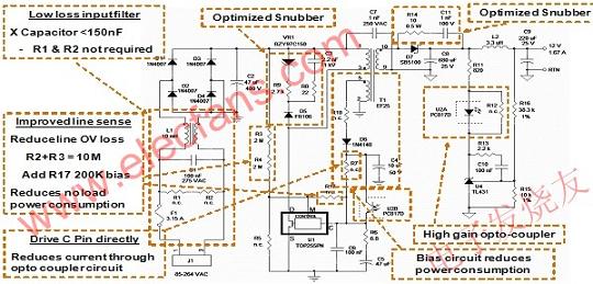 圖1:用PowerIntegrations的TOPSwitch-HX優(yōu)化過(guò)的開(kāi)關(guān)電源。