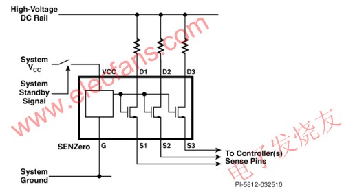 在消除市電輸入的電流消耗之后,接下來(lái)需要消除電路中的那些即使在待機(jī)狀態(tài)下也會(huì)連續(xù)消耗功率的其他元件的電流消耗。在較高功率應(yīng)用中,在高壓母線與功率因數(shù)校正(PFC)和DC/DC轉(zhuǎn)換器的電源控制器之間可能存在多條信號(hào)通路。例如包括PFC系統(tǒng)中連接升壓控制器的前饋或反饋信號(hào)通路,以及雙開(kāi)關(guān)正向/LLC/半橋和全橋轉(zhuǎn)換器中的前饋信號(hào)通路。PI的第二款新產(chǎn)品是SENZero,它可以在不需要這些信號(hào)通路時(shí)將它們隔離,從而消除不必要的功率損耗。SENZero的典型應(yīng)用如圖4所示。