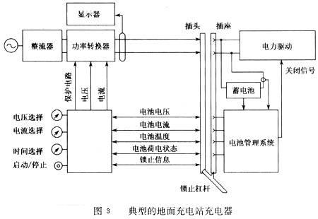 圖3為一典型的地面充電站中充電器的方案,該充電器由一個能將輸人的交流電轉(zhuǎn)換為直流電的整流器和一個能調(diào)節(jié)直流電功率的功率轉(zhuǎn)換器組成,通過把帶電線的插頭插入電動汽車上配套的插座中,直流電能就輸入蓄電池對其充電。充電器設置了一個鎖止杠桿以利于插入和取出插頭,同時杠桿還能提供一個確定已經(jīng)鎖緊的信號以確保安全。根據(jù)充電器和車上電池管理系統(tǒng)相互之間的通訊,功率轉(zhuǎn)換器能在線調(diào)節(jié)直流充電功率,而且充電器能顯示充電電壓、充電電流、充電量和充電費用等。