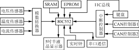 系統(tǒng)的主要功能包括數(shù)據(jù)采集、電量估計(jì)及顯示診斷等。由于80C552具有8路10位A/D轉(zhuǎn)換的功能,因此,采集模塊先采用線性光耦法測(cè)量單電池的電壓,通過其4個(gè)A/D口將模擬量轉(zhuǎn)換為數(shù)字量存入存儲(chǔ)器,溫度測(cè)量采用單總線技術(shù),使用Dallas數(shù)字芯片來測(cè)量溫度,該芯片具有12位的精度等級(jí),能非常準(zhǔn)確地測(cè)量到系統(tǒng)的溫度??傠妷骸㈦娏餍盘?hào)通過特殊的傳感器將其信號(hào)轉(zhuǎn)換為0~10V的信號(hào),通過14位的A/D轉(zhuǎn)換器件轉(zhuǎn)換為數(shù)字量存入系統(tǒng)。