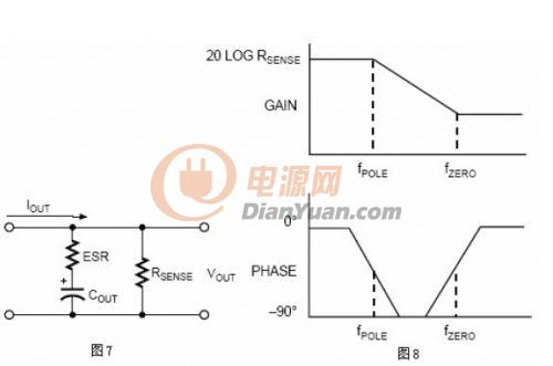 輸出電容的ESR和反饋網絡的電阻(R1+R2=RFB)反映出輸出濾波器傳輸函數的特性。圖7的電路分析給出ESR和RSENSE的影響。