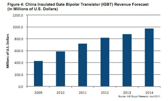 據(jù)IHS iSuppli公司的研究,由于工業(yè)與消費領(lǐng)域的需求增長,中國絕緣柵雙極型晶體管(IGBT)市場未來幾年將快速增長,2014年銷售額將從2009年的4.297億美元上升到9.75億美元,增長一倍以上。
