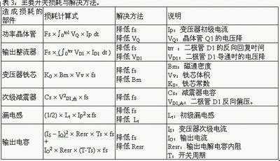 開關(guān)電源的損耗包含導(dǎo)通損耗、開關(guān)損耗以及外圍控制電路損耗,電路不同部分的損耗成因各不相同,因此抑制損耗的方法也有不同。需要用數(shù)學(xué)方程式量化這些損耗,進(jìn)而整理出降低各部分損耗的方法,才能得出具體有效降低整體損耗的方案。為了討論方便,本文以常用的回掃轉(zhuǎn)換器為例,將各部分損耗以數(shù)學(xué)方程式表示,并列出解決方法。表2、表3及表4分別為導(dǎo)通損耗、切換損耗以及外圍控制電路損耗的原因分析與解決對策。