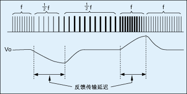 當(dāng)負(fù)載降低到一定程度時,脈沖跳躍機制將使有效開關(guān)頻率減半,這意味著轉(zhuǎn)換器供應(yīng)負(fù)載的功率減半,因此回掃電路將增加脈沖寬度以補足輸出負(fù)載所需要的功率,而在脈沖寬度增加到負(fù)載所需功率之前,輸出電壓將產(chǎn)生突降。相反的情形發(fā)生在等效開關(guān)頻率增加時,輸出電壓將發(fā)生突升。這種負(fù)載變動時輸出電壓突升與突降是開關(guān)頻率非連續(xù)變動(以整數(shù)倍增加或降低)的必然結(jié)果。