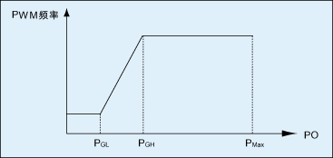圖4顯示了非導(dǎo)通時間調(diào)制的基本原理。當(dāng)負(fù)載改變時,開關(guān)頻率將連續(xù)降低或增加,開關(guān)頻率與輸出功率的關(guān)系如圖5所示。低負(fù)載或空載時這種連續(xù)調(diào)變降低開關(guān)頻率的方式除了可以有效降低能量損失外,還可以避免前兩種方法中輸出電壓突升或突降的問題。