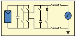 無(wú)變壓器的DC/AC逆變器在歐洲廣泛應(yīng)用,但是在美國(guó),這種產(chǎn)品只是最近才在某些地區(qū)被使用。無(wú)變壓器的逆變器拓?fù)浣Y(jié)構(gòu)有很多種,而Fraunhofer研究所開(kāi)發(fā)的HERIC拓?fù)浔憩F(xiàn)出了很高的效率。傳統(tǒng)的全橋逆變器的結(jié)構(gòu)如圖1所示,HERIC拓?fù)淙鐖D2所示,此圖中還顯示了兩種新的開(kāi)關(guān)/二極管對(duì)。這種拓?fù)淅锚?dú)有的續(xù)流路徑來(lái)減小開(kāi)關(guān)和導(dǎo)通損耗,使效率提升到98%以上。
