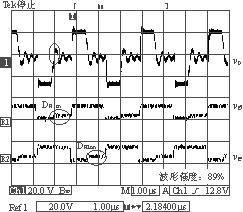 IM-CDR結(jié)構(gòu)選擇如圖1(c)所示的拓?fù)?。從結(jié)構(gòu)上可以看出,磁芯的3個(gè)磁柱上都加了相同的氣隙(lg),這必然會(huì)導(dǎo)致變壓器原邊的漏感(Lk)的增大,但可以利用變壓器原邊漏感中的能量實(shí)現(xiàn)副邊同步整流管的自驅(qū)動(dòng)(開通),同步管的關(guān)斷是通過(guò)外加驅(qū)動(dòng)信號(hào)來(lái)完成的。實(shí)驗(yàn)電路如圖2所示,由圖2可以看到副邊同步管的驅(qū)動(dòng)電路包括一個(gè)繞組(Na),兩個(gè)二極管(Da1,Da2)和兩個(gè)MOS管(Sa1,Sa2),它的實(shí)現(xiàn)比較簡(jiǎn)單,只需要在磁芯的中心磁柱上多加一組繞組即可。變壓器原邊采用的是對(duì)稱半橋拓?fù)洹?shí)驗(yàn)電路的具體參數(shù)見表1所列。實(shí)驗(yàn)波形圖如圖3和圖4所示。圖3是在負(fù)載電流Io=4A時(shí)測(cè)得的變壓器原邊電壓波形以及兩個(gè)同步整流管的門極驅(qū)動(dòng)電壓波形圖。由于此時(shí)的負(fù)載電流較小,反映到變壓器原邊的激磁電流也較小,在原邊開關(guān)管關(guān)斷的瞬間,變壓器原邊漏感(Lk)與開關(guān)管輸出結(jié)電容(Co1,Co2)間的振蕩尖峰不夠高,不足以開通副邊的同步整流管。