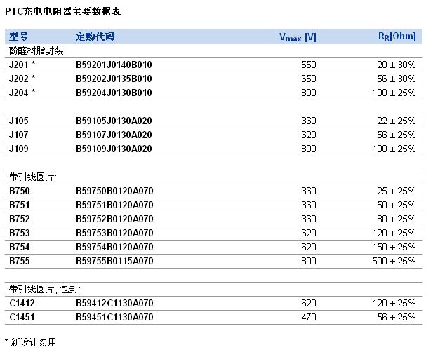 普通電阻在電容充電時(shí)常用來限制電流。不過,這常有技術(shù)風(fēng)險(xiǎn)。舉例來說,當(dāng)短接電容器時(shí),如果電容器短路或者繼電器失靈,電阻器將持續(xù)暴露在大功率電平下。這可能導(dǎo)致電阻器或者整個(gè)系統(tǒng)遭到破壞。愛普科斯采用基于PTC陶瓷的新式J20X系列充電電阻器,現(xiàn)已研發(fā)出一種專業(yè)解決方案:在自我防護(hù)的同時(shí),還實(shí)現(xiàn)了相對緊湊的尺寸。如下表所示,J20X系列包括J201、J202和J204產(chǎn)品。