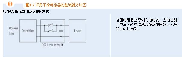 當(dāng)電容器充電時(shí),通常需要串聯(lián)一個(gè)電阻器來限制充電電流,以免產(chǎn)生超過允許范圍的強(qiáng)電流峰值。一般是采用固定式普通電阻或負(fù)溫度系數(shù)(NTC)電阻實(shí)現(xiàn)這一功能。在大多數(shù)情況下,會在充電之后使用一個(gè)由時(shí)間或電壓控制的繼電器來短接限流元件。充電電流的制約對整流器和轉(zhuǎn)換器系統(tǒng)來說非常重要,因?yàn)楫a(chǎn)生的沖擊電流峰值如果未得到限制,可能會觸發(fā)熔絲或使整流器遭受超過允許范圍的強(qiáng)電流。圖1所示為傳統(tǒng)整流器或轉(zhuǎn)換器系統(tǒng)的方塊圖。