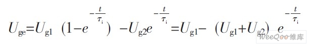 二極管D1導(dǎo)通時(shí), 若Uge為所加的反向電壓值(可記為-Ug2, 正向電壓記為+Ug1), 集電極電流iC=0, Uce=U2。開(kāi)通后, U1向Cgc、Cge充電, 此時(shí)Uge可寫(xiě)成: