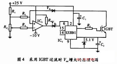 當電源輸出過載或者短路時,IGBT的Vce值則變大,根據(jù)此原理可以對電路采取保護措施。對此通常使用專用的驅(qū)動器EXB841,其內(nèi)部電路能夠很好地完成降柵以及軟關斷,并具有內(nèi)部延遲功能,可以消除干擾產(chǎn)生的誤動作。其工作原理如圖4所示,含有IGBT過流信息的Vce不直接發(fā)送到EXB841的集電極電壓監(jiān)視腳6,而是經(jīng)快速恢復二極管VD1,通過比較器IC1輸出接到EXB841的腳6,從而消除正向壓降隨電流不同而異的情況,采用閾值比較器,提高電流檢測的準確性。假如發(fā)生了過流,驅(qū)動器:EXB841的低速切斷電路會緩慢關斷IGBT,從而避免集電極電流尖峰脈沖損壞IGBT器件。