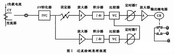 過流檢測傳感器的工作原理如圖1所示。通過變流器所獲得的變流器次級電流經(jīng)I/V轉(zhuǎn)換成電壓,該電壓直流化后,由電壓比較器與設定值相比較,若直流電壓大于設定值,則發(fā)出辨別信號。但是這種檢測傳感器一般多用于監(jiān)視感應電源的負載電流,為此需采取如下措施。由于感應電源啟動時,啟動電流為額定值的數(shù)倍,與啟動結(jié)束時的電流相比大得多,所以在單純監(jiān)視電流電瓶的情況下,感應電源啟動時應得到必要的輸出信號,必須用定時器設定禁止時間,使感應電源啟動結(jié)束前不輸出不必要的信號,定時結(jié)束后,轉(zhuǎn)入預定的監(jiān)視狀態(tài)。