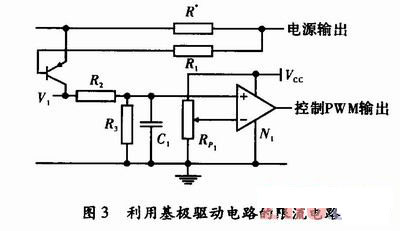 在一般情況下,利用基極驅(qū)動電路將電源的控制電路和開關晶體管隔離開??刂齐娐放c輸出電路共地,限流電路可以直接與輸出電路連接,工作原理如圖3所示,當輸出過載或者短路時,V1導通,R3兩端電壓增大,并與比較器反相端的基準電壓比較??刂芇WM信號通斷。