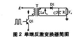 功率轉(zhuǎn)換部分采用單端反激電路,結(jié)構(gòu)如圖2。當(dāng)加到原邊主功率開關(guān)管Q1的激勵脈沖為高電平使Q1導(dǎo)通時,直流輸入電壓加在原邊繞組兩端,由于此時副邊繞組相位是上負(fù)下正,整流管D1反向偏置截止,原邊電感儲存能量;當(dāng)激勵脈沖為低電平使Q1截止時,原邊繞組兩端電壓極性反向,副邊繞組相位變?yōu)樯险仑?fù),整流管正向偏置導(dǎo)通,變壓器儲存的能量向副邊釋放。在此開關(guān)過程中,高頻變壓器既起變壓隔離作用,又起電感儲能作用。