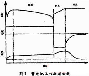 蓄電池在工作工程中主要具有3種工作狀態(tài):放電狀態(tài)、充電狀態(tài)和浮充狀態(tài)。處于放電狀態(tài)時(shí),蓄電池將儲(chǔ)蓄的化學(xué)能轉(zhuǎn)化為電能供給負(fù)載;充電狀態(tài)是在蓄電池放電之后進(jìn)行能量?jī)?chǔ)蓄的狀態(tài),此種狀態(tài)下電能轉(zhuǎn)化為化學(xué)能存儲(chǔ)起來(lái);浮充狀態(tài)則是蓄電池維持一定化學(xué)能存儲(chǔ)量所要保持的工作狀態(tài),浮充狀態(tài)下的蓄電池的儲(chǔ)能不會(huì)因?yàn)樽苑烹姸鴵p失。放電、充電、浮充電3個(gè)狀態(tài)構(gòu)成蓄電池的一個(gè)完整的工作循環(huán)。傳統(tǒng)的充電器采用串聯(lián)充電方式,通過(guò)各個(gè)電池的電流都是一樣的。盡管采用了三段式的充電方法,但是充電時(shí)能控制的電壓只是電池組的串聯(lián)電壓,仍然伴有電池組充電不均衡并且擴(kuò)大的現(xiàn)象。蓄電池工作狀態(tài)曲線如圖1所示。因此在此基礎(chǔ)上采用一種新的解決方法。