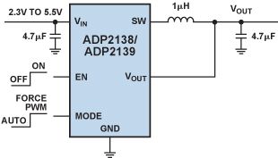 ADP2138 是一款緊湊型 800 mA、3 MHz、降壓 DC-DC 轉(zhuǎn)換器。圖 4所示為典型應(yīng)用電路。圖 5顯示了強(qiáng)制 PWM工作模式下和自動(dòng) PWM/PSM 工作模式下的效率改善情況。由于頻率存在變化,PSM 干擾可能難以濾除,因此許多降壓調(diào)節(jié)器提供一個(gè) MODE 引腳(如圖 4 所示),用戶可以通過該引腳強(qiáng)制器件以連續(xù) PWM 模式工作,或者允許器件以自動(dòng) PWM/PSM 模式工作。MODE 引腳既可以通過硬連線來設(shè)置任一工作模式,也可以根據(jù)需要而動(dòng)態(tài)切換,以達(dá)到省電目的。