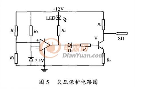 欠壓保護(hù)電路如圖5所示,它監(jiān)測蓄電池的電壓狀況,如果蓄電池電壓低于預(yù)設(shè)的10.8V,保護(hù)電路開始工作,使控制器SG3524的腳10關(guān)斷端輸出高電平,停止驅(qū)動(dòng)信號(hào)輸出。