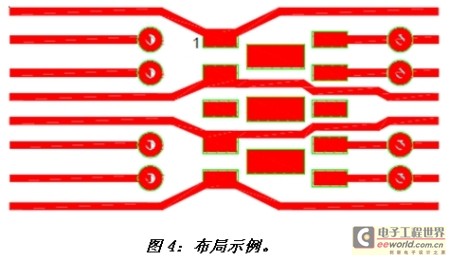 圖4顯示了RClamp2574N的流通型PCB走線。信號(hào)線連接到第1、2、4、5、6、7、9和10腳。第3腳與8腳連接到三個(gè)中心接地。在一個(gè)典型以太網(wǎng)應(yīng)用中,這些引腳以及接地都應(yīng)懸空(即不接地)。在本例中,走線寬度為0.005英寸。過孔用于第6、7、9和10腳的換層連接,這樣所有八根信號(hào)線都可采用易于實(shí)現(xiàn)的流通型(flow though)布局。