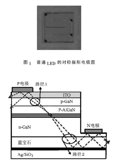圖2 模擬了光在ODR LED 內(nèi)部發(fā)射時(shí)所經(jīng)過的路徑: 當(dāng)在p,n 電極上加上正向壓降時(shí),p 區(qū)空穴與n 區(qū)電子向有源區(qū)運(yùn)動(dòng)并發(fā)生輻射復(fù)合,發(fā)出的光線有兩條路徑,一條直接射出如圖2 中路徑1,另一條射向襯底下的全方位反射鏡,并發(fā)生反射,從頂面或側(cè)面射出如圖2 中路徑2,從而增加光射出的路徑,增強(qiáng)LED的光通量與光效.