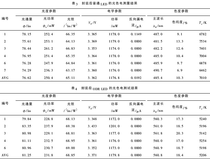 對(duì)封裝后的樣品選取普通LED 和ODR LED 各7個(gè),兩類LED中不同樣品各自編號(hào),先進(jìn)行LED的快速光色電測(cè)試,測(cè)試儀器為杭州遠(yuǎn)方HAAS- 2000 LED 快速光色電綜合測(cè)試量系統(tǒng),測(cè)試溫度為25℃,測(cè)試電流為350 mA,兩組LED 的測(cè)試結(jié)果如下,表3 中去除5 號(hào)、表4 中去除5 號(hào)和7 號(hào)等性能不佳的樣品,兩組樣品測(cè)量反向漏電流時(shí)的反向電壓均為- 5. 008 V.