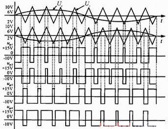 本文采用調(diào)制法產(chǎn)生PWM波形,采用等腰三角波作為載波,因為等腰三角波上任一點的水平寬度和高度成線性關(guān)系且左右對稱,當(dāng)它與任何一個平緩變化的調(diào)制信號波相交時,如果在交點時刻對電路中開關(guān)器件的通斷進行控制,就可以得到正比于信號波幅值的脈沖,這正好符合PWM控制的要求。