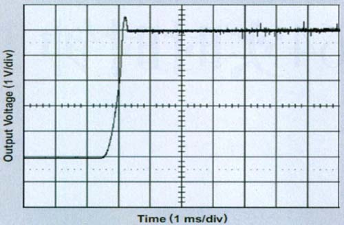 在一些典型的啟動應用中,TPS64203限流值慢慢上升,以提供限流的受控軟啟動。在這種應用中,限流電路和軟啟動均無效;因此,啟動浪涌電流會很大,而輸出電壓會稍稍過沖,如圖 4 所示。