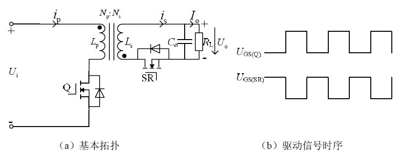 反激變換器次級的整流二極管用同步整流管SR 代替,構(gòu)成同步整流反激變換器,基本拓?fù)淙鐖D1(a)所示。為實(shí)現(xiàn)反激變換器的同步整流,初級MOS 管Q 和次級同步整流管SR 必須按順序工作,即兩管的導(dǎo)通時間不能重疊。當(dāng)初級MOS 管Q 導(dǎo)通時,SR 關(guān)斷,變壓器存儲能量;當(dāng)初級MOS 管Q 關(guān)斷時,SR 導(dǎo)通,變壓器將存儲的能量傳送到負(fù)載。驅(qū)動信號時序如圖1(b)所示。在實(shí)際電路中,為了避免初級MOS 管Q 和次級同步整流管SR 同時導(dǎo)通,Q 的關(guān)斷時刻和SR 導(dǎo)通時刻之間應(yīng)有延遲;同樣Q 的導(dǎo)通時刻和SR 的關(guān)斷時刻之間也應(yīng)該有延遲。
