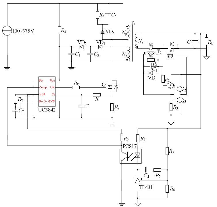 反激變換器應(yīng)用廣泛,采用同步整流技術(shù)能夠很好的提高反激變換器效率,同時為使同步整流管的驅(qū)動電路簡單,采用分立元件構(gòu)成驅(qū)動電路。本文詳細(xì)分析了同步整流反激變換器的工作原理和該驅(qū)動電路的工作原理,并在此基礎(chǔ)上設(shè)計(jì)了100V~375VDC 輸入,12V/4A 輸出的同步整流反激變換器,工作于電流斷續(xù)模式,控制芯片選用UC3842,對設(shè)計(jì)過程進(jìn)行了詳細(xì)論述。通過Saber 仿真驗(yàn)證了原理分析的正確性,證明該變換器具有較高的變換效率。