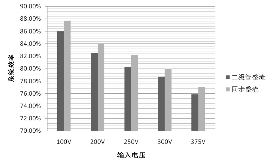 仿真結(jié)果與本文對同步整流反激變換器和同步整流管驅(qū)動電路的工作原理分析一致。同時仿真結(jié)果證明,該驅(qū)動電路可以很好實(shí)現(xiàn)同步整流功能,采用同步整流技術(shù)可以較好提高傳統(tǒng)反激變換器的效率。輸入電壓100V,滿載時,變換器效率最高為87.7%。