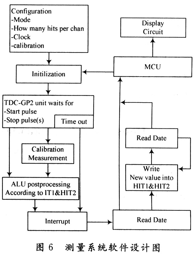 初始化之后,TDC-GP2高速測量單元接收到START脈沖后開始工作,達(dá)到設(shè)置的采樣數(shù)或者遇到測量溢出后才停止工作。軟件設(shè)計的重點(diǎn)在于根據(jù)需要設(shè)置TDC-GP2的工作模式和讀取其內(nèi)部的測量數(shù)據(jù)。在測量結(jié)尾,ALU開始依照HIT1和HIT2的設(shè)置處理數(shù)據(jù)并把結(jié)果送入輸出寄存器。如果不進(jìn)行校準(zhǔn),ALU傳輸16位原始數(shù)據(jù)到輸出寄存器;如果進(jìn)行校準(zhǔn),則ALU傳輸32位的固定浮點(diǎn)數(shù)到輸出寄存器。然后通過單片機(jī)AT89S52處理后,在液晶顯示器讀取時間間隔數(shù)據(jù),其測量流程如圖6所示。