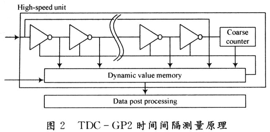 該系統(tǒng)主要由脈沖產(chǎn)生器、數(shù)據(jù)處理單元、時間數(shù)字轉(zhuǎn)換器、溫度測量單元、時鐘控制單元、配置寄存器以及與單片機(jī)相接的SPI接口組成。在實(shí)際應(yīng)用中,由于TDC-GP2的功耗很低,使得TDC-GP2的輸入/輸出電壓(工作電壓)為1.8~5.5 V,核心電壓為1.8~3.6 V,所以可以采用電池供電,使用方便。同時單片機(jī)由4線的SPI接口相連,可以把TDC-GP2作為單片機(jī)的一個外圍設(shè)備來操作。通過內(nèi)部ALU單元計算出時間間隔,并將結(jié)果送入結(jié)果寄存器保存起來。通過對TDC-GP2內(nèi)部寄存器的設(shè)置,可以多次采樣并將結(jié)果保存。TDC-GP2是基于內(nèi)部的模擬電路測量“傳輸延時”來進(jìn)行的,是以信號通過內(nèi)部門電路的傳播延遲來進(jìn)行高精度時間間隔測量的。TDC-GP2時間間隔測量原理如圖2所示。