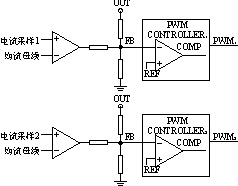 通過檢測RC網絡中C兩端的電壓,作為電流信號,幾路電流信號(本例只有兩路)通過一個相同的電阻就得到了平均值均流母線,平均值均流母線電壓值與負載有關,表征負載電流的大小。然后將每路采樣來的電流信號與母線電壓比較,得到誤差信號,去修正輸出電壓參考信號,從而對PWM控制器的占空比輸出進行微調,達到均流和穩(wěn)壓的目的。
