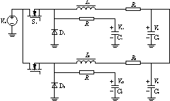 式中:Vc1、Vc2分別為C1和C2上電壓的平均值;IL1、IL2分別是L-和L2流過電流的平均值,亦即兩路輸出電流平均值;R1及R2是濾波電感的等效串聯(lián)電阻,當在工藝上設計并聯(lián)電源每路輸出電感基本上一樣時,可以認為R1=R2。因此,要控制兩路電流均流,即要求IL1=IL2,于是,只要控制Vc1=Vc2就行了。所以,電容C1及C2上的電壓Vc1和Vc2可以代表兩路電流IL1及IL2大小,可用來進行均流控制。